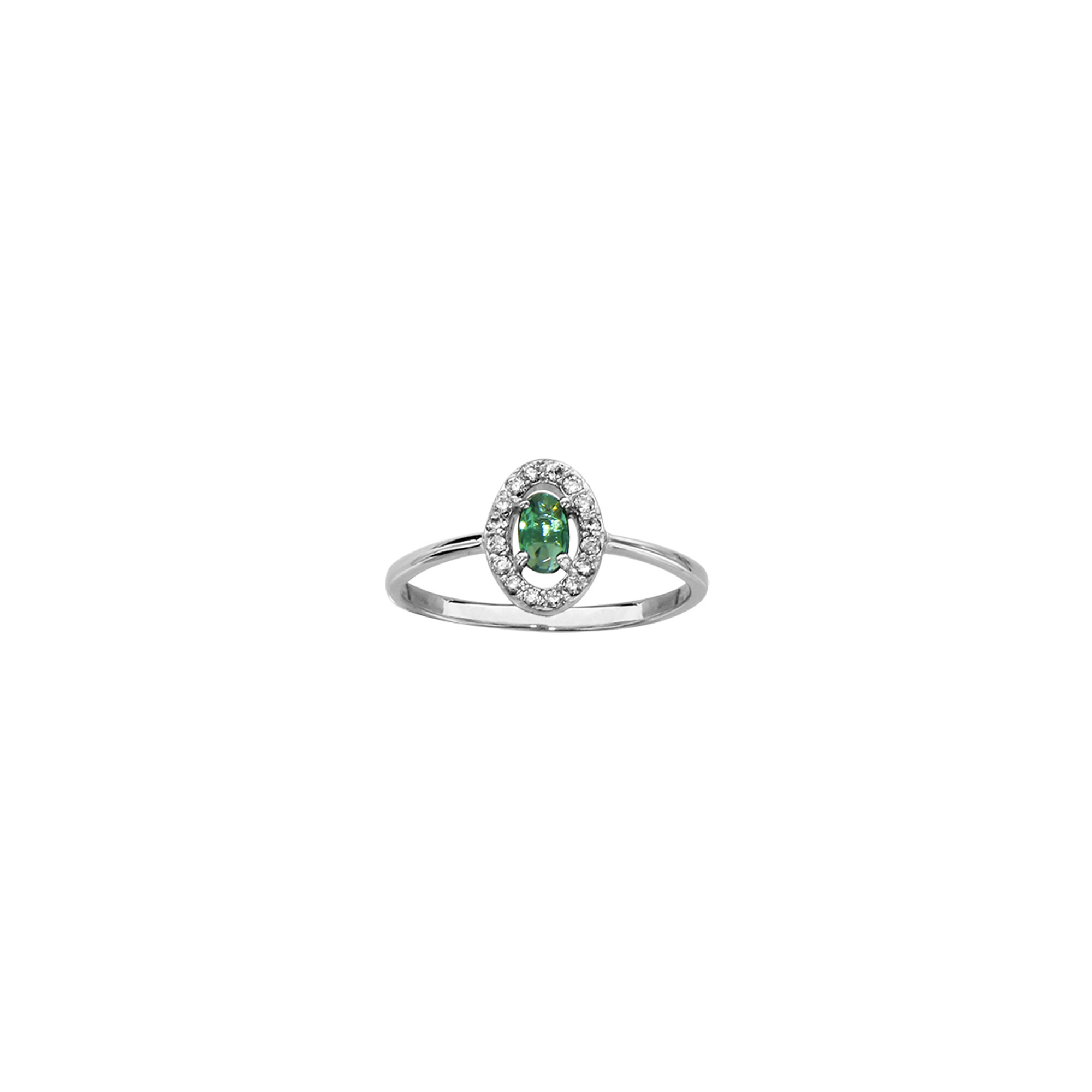 Bague en argent rhodié, verre vert et oxydes de zirconium Description détaillée
