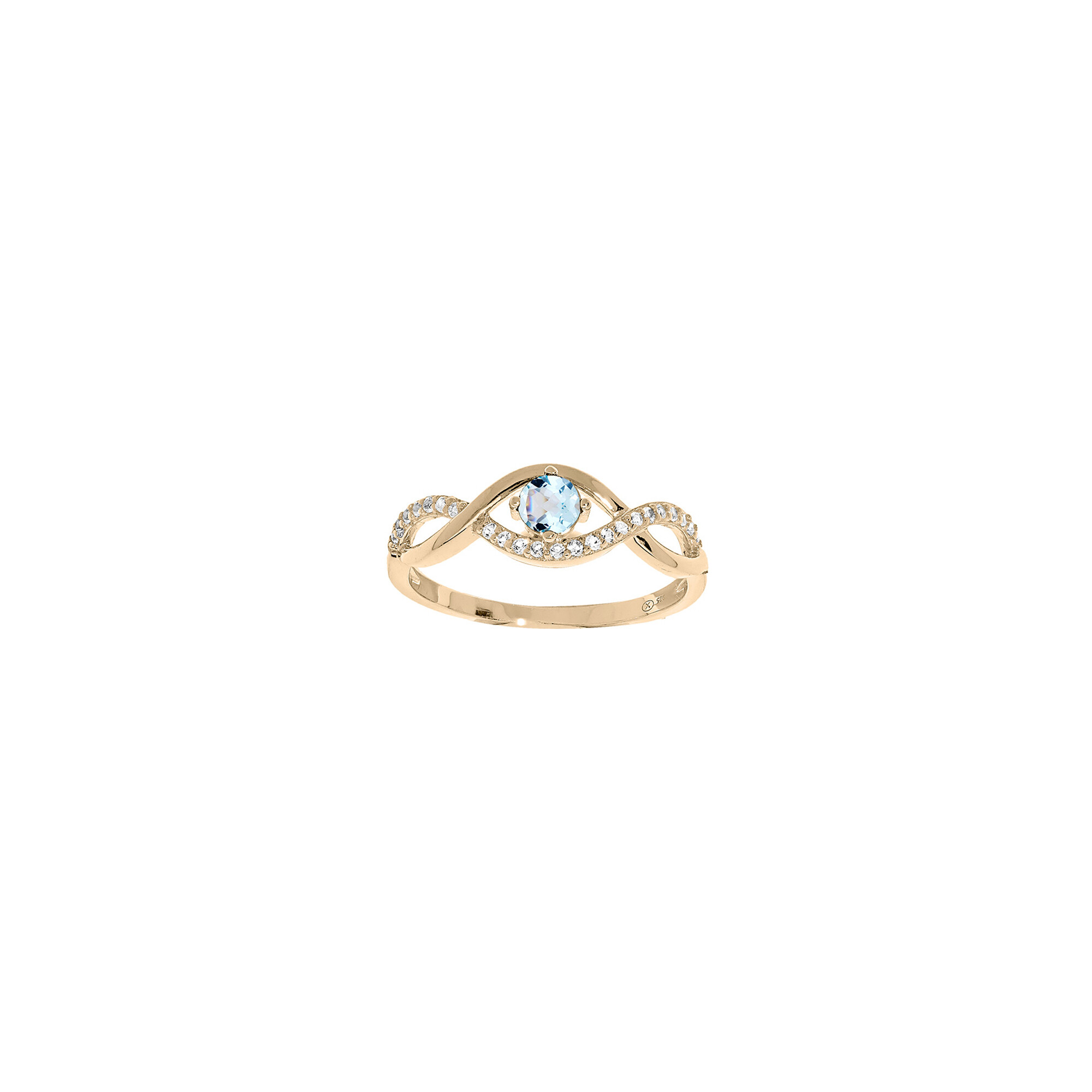 Bague en plaqué or, topaze bleue et oxydes de zirconium, taille 54 Description détaillée